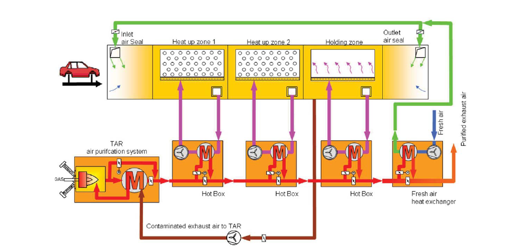 热回收式直燃炉(TNV/TAR)有内置换热器,运行温度在700℃到800℃之间,可以处理的VOC种类众多,适合小气量高浓度废气,,也适用间断性生产。TNV/TAR的排气温度较高(一般在300℃~400℃),可利用余热较丰富,因此特别适合涂布线烘干炉、涂装线烘干炉的废气处理和余热利用。